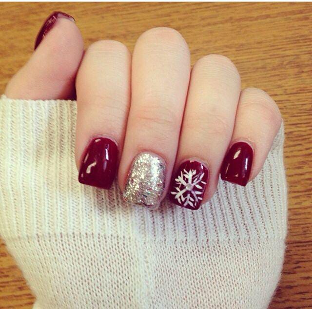 Deep berry-red nails contrasted with bright icy-white shimmer and simple white snowflake designs make this January manicure bold but still perfectly seasonal.