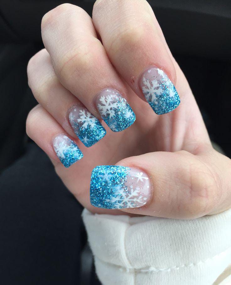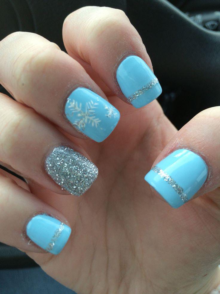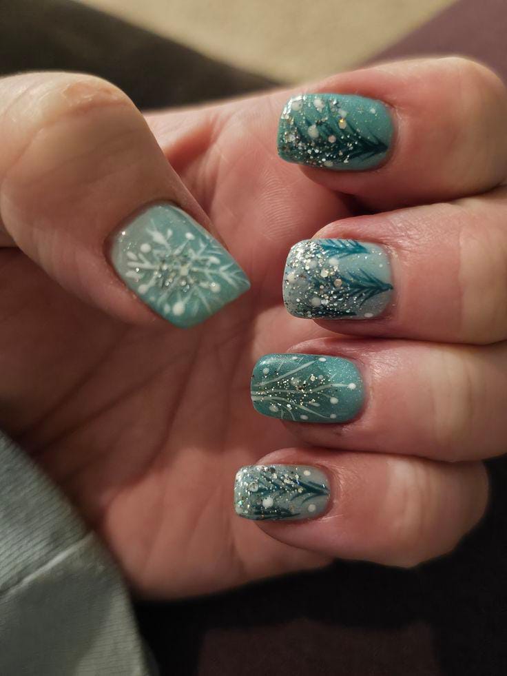 A cool teal set featuring soft snowflake patterns and subtle glitter, giving the nails a frosty, winter-January morning feel. The mix of shimmer and delicate white detailing creates a cozy, wintry vibe.