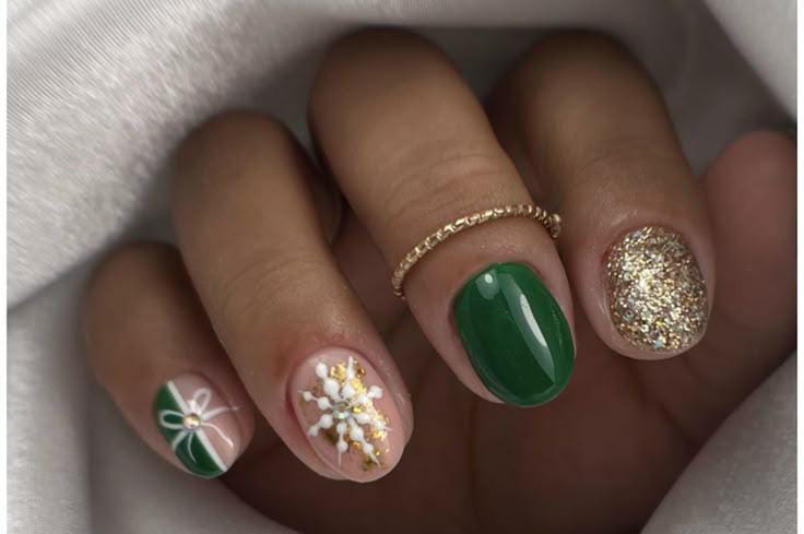 This design blends deep green, soft nude, and sparkling gold for a classy winter palette. Snowflake accents and tiny gold details give it a cozy, holiday-inspired feel with a January finish.