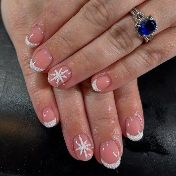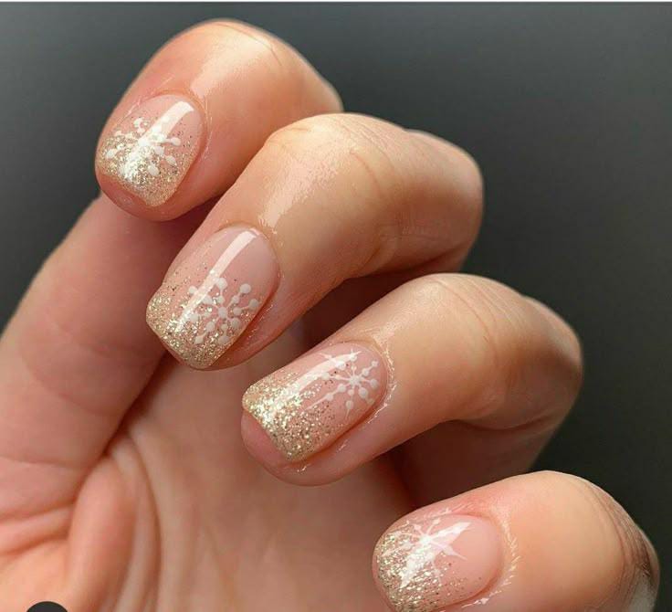 These nails mix soft, natural nude tones with shimmering glitter tips, accented by delicate white snowflakes for a subtle wintery look. The design feels light, cozy, and perfect for early-January vibes.