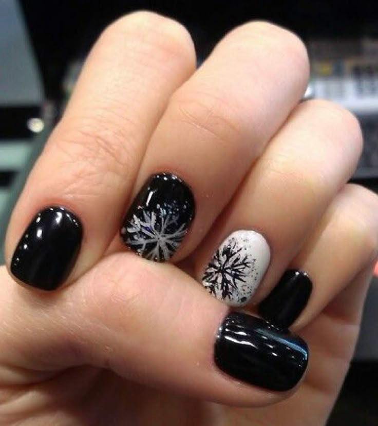 A bold combination of glossy black and crisp white creates a striking contrast, highlighted by sharp snowflake designs. The overall vibe is chic and wintry, perfect for those who like darker January nails.
