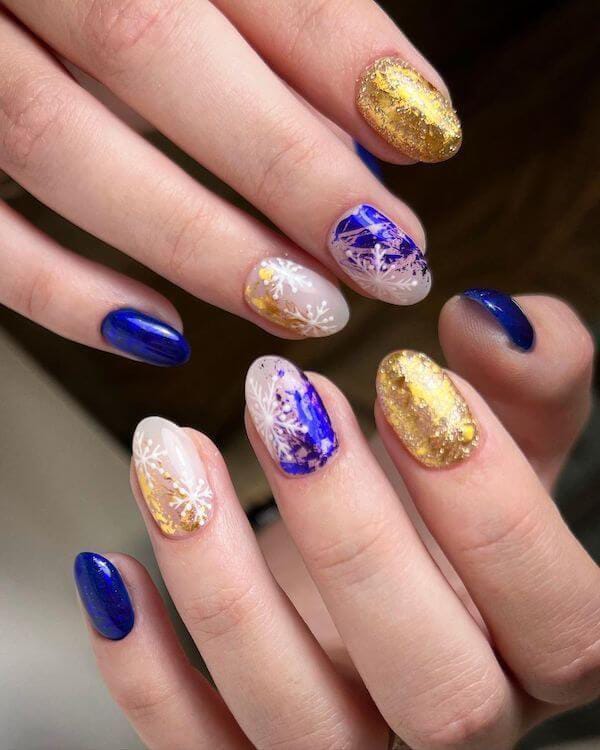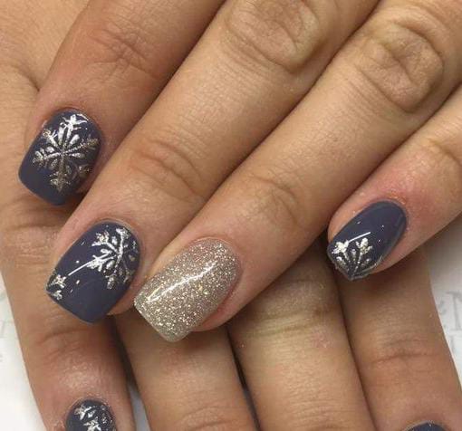 Deep slate-blue nails with shimmering snowflake designs give a bold winter feel, while the gold glitter accent nail adds warmth and contrast. The mix of cool and metallic tones makes the design chic and festive for January.