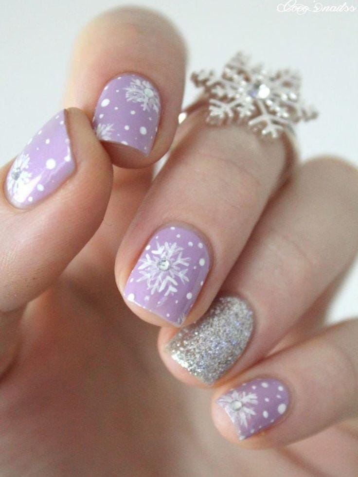 A soft lilac base is decorated with delicate white snowflakes and scattered dots, giving the nails a light, wintry January feel. One accent nail in silver glitter adds extra sparkle and contrast.