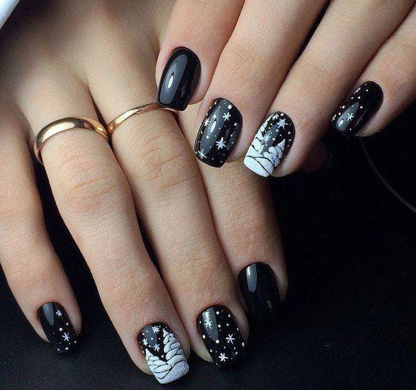 Glossy black nails are paired with white hand-painted trees and tiny stars, creating a bold nighttime January winter scene. The contrast makes the whole design feel crisp, dramatic, and festive.