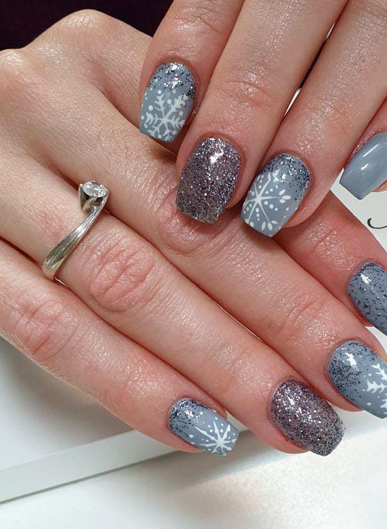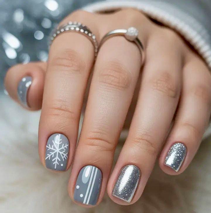 Muted grey tones blend beautifully with chunky glitter accents and simple white snowflakes. The look is cool, clean, and perfect for a cozy January vibe.