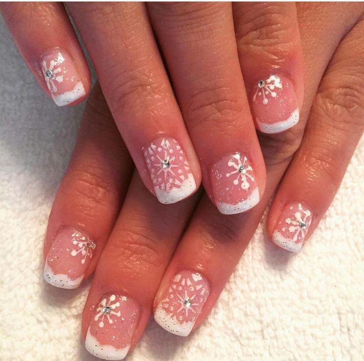 A sheer pink base with white French tips gets a winter twist with delicate snowflakes and tiny rhinestones. The design feels fresh, feminine, and softly seasonal January finish.