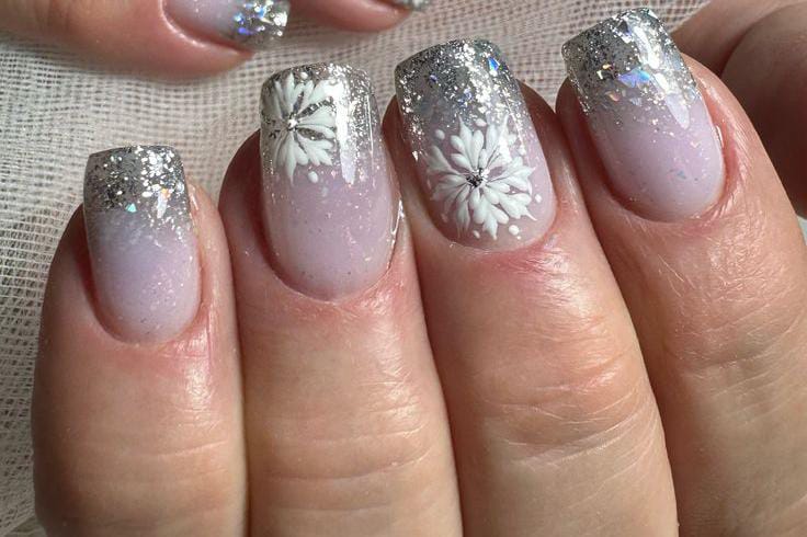 A gradient of pale icy pink to silver glitter is topped with soft white floral snowflake shapes. The mix of shimmer and frosted detailing gives the design an elegant, frosty January glow.