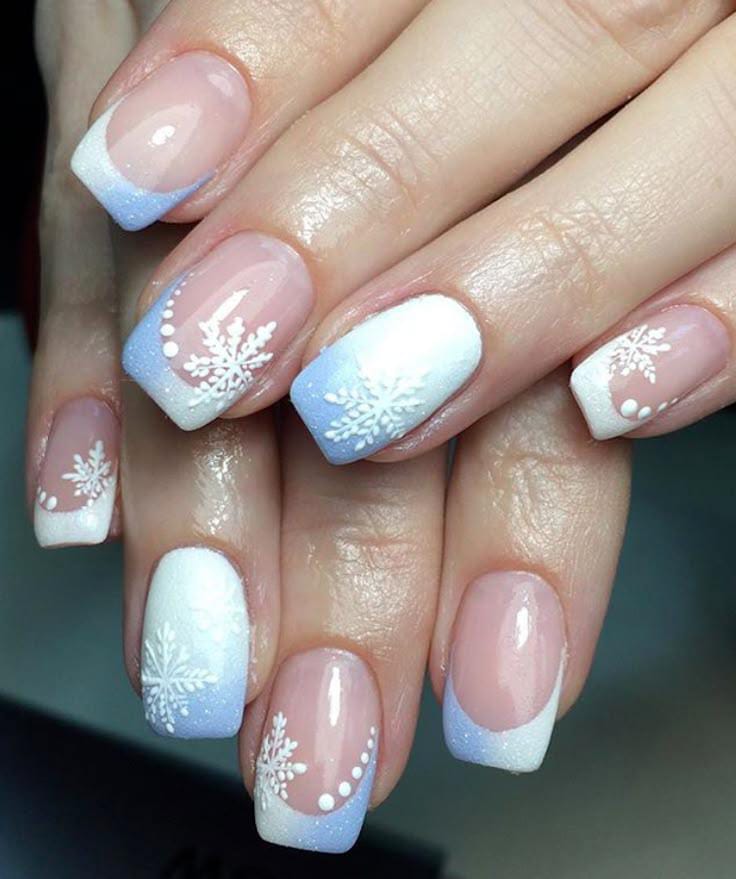This design features soft blue-to-white gradient tips with delicate white snowflake accents, giving the nails a frosty, winter-morning vibe. The sheer pink base keeps everything light, fresh, and perfect for a cozy January look.