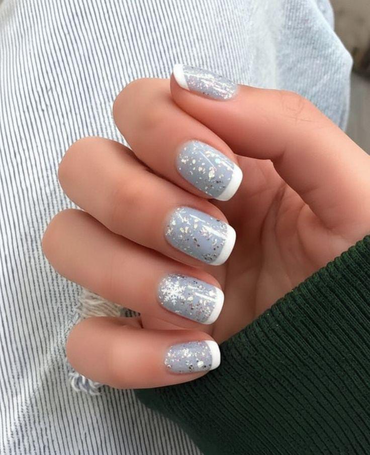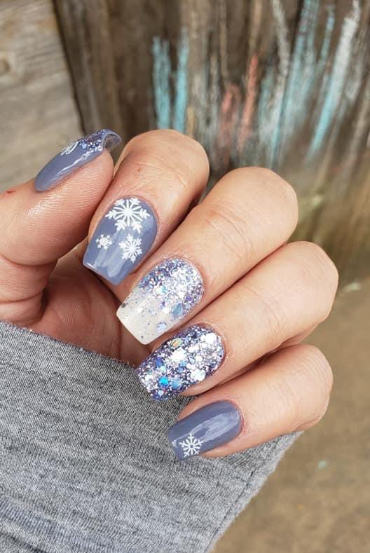 Muted slate-blue nails combine with chunky silver-blue glitter and small white snowflakes, creating a fun, frosty, and textured January winter style.