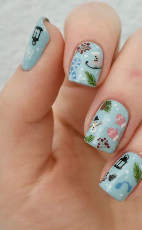 Playful hand-painted winter motifs—like greenery, small icons, and snowy details—sit on a muted blue base, giving the nails a cozy, storybook-style January charm.