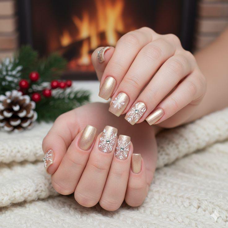 These nails feature a warm champagne-gold shimmer with delicate white snowflakes, creating a soft, glowing winter look. The design feels festive yet calm—ideal for easing into January with a touch of sparkle.