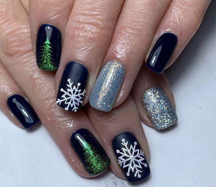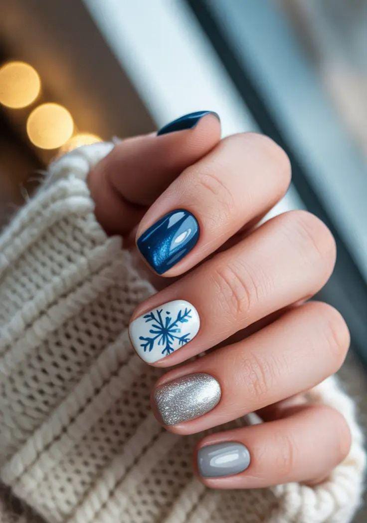 A cozy winter combo of deep navy, silver shimmer, and a crisp white accent nail featuring a bold blue snowflake. The look feels festive and modern January winter without being overdone.