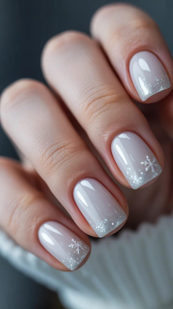 Soft milky-white nails with delicate snowy glitter at the tips and tiny snowflake accents create a clean, minimal, and elegant winter january look.