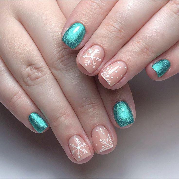 Shimmery green nails mixed with nude bases decorated with crisp white snowflakes and dotted winter patterns give this design a fresh, playful January vibe.