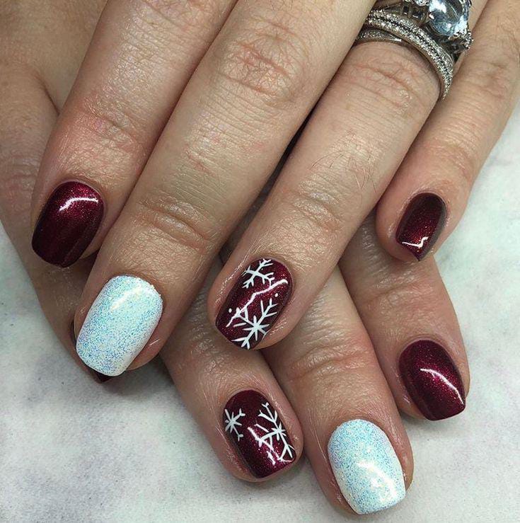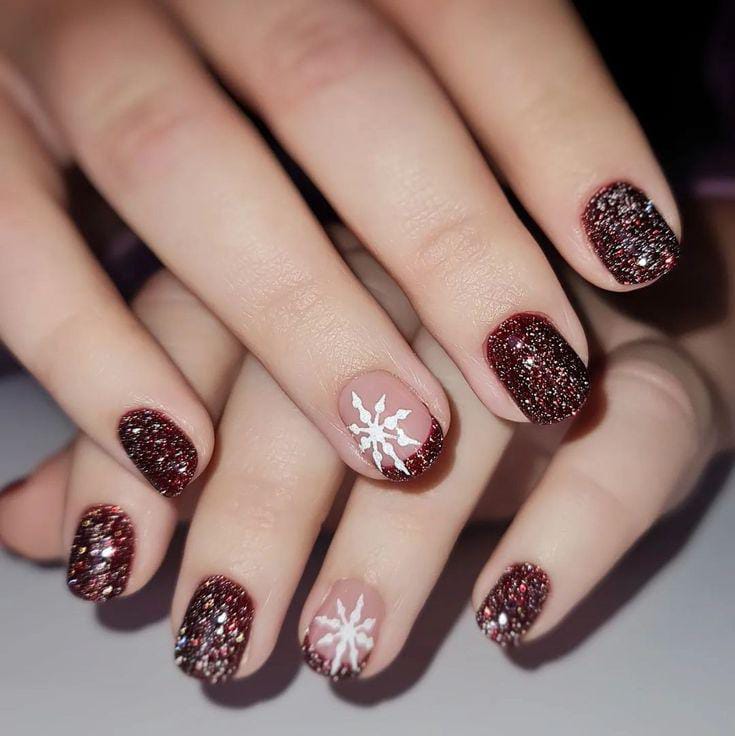Deep glittery burgundy nails paired with two nude nails featuring crisp white snowflakes, creating a bold but elegant cold-season, January aesthetic. The sparkles make the whole look feel warm and festive.