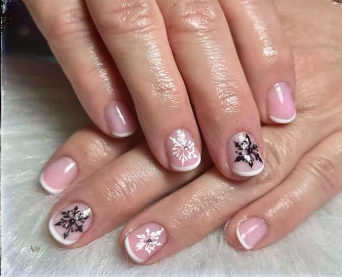 Soft pink nails get a gentle French outline and small white and black snowflake-floral designs. It’s a simple, elegant take on winter nail art with a minimalist January twist.