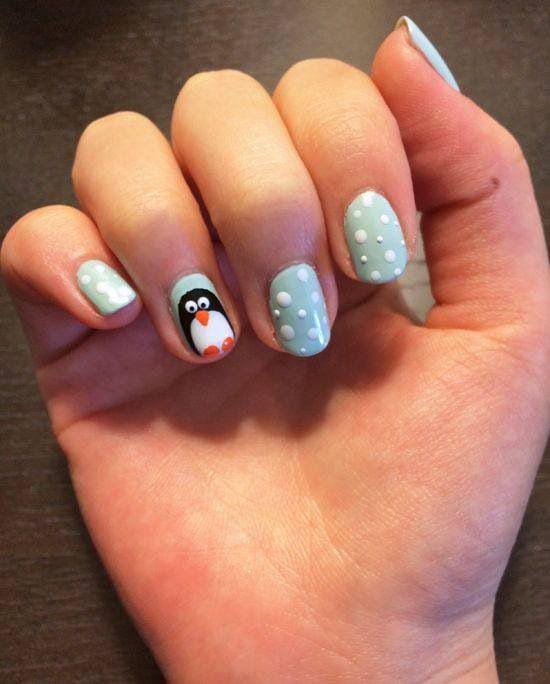 A soft pastel blue base paired with raised white dots and an adorable penguin accent nail creates a fun, lighthearted winter look that feels sweet and cheerful January.