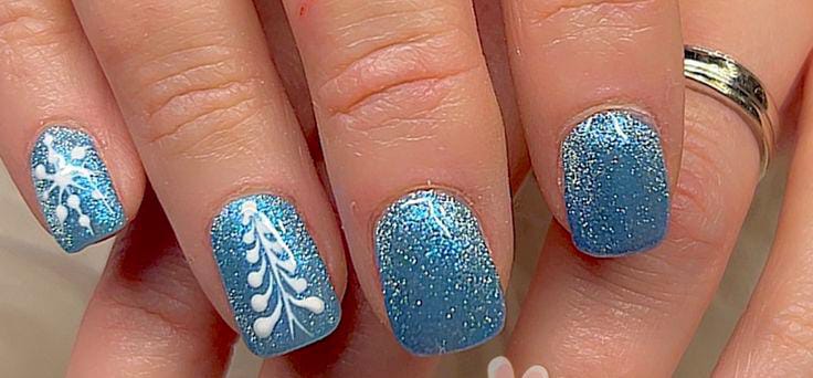 Bright icy blue glitter nails are accented with white snowflake and branch-like patterns. The design feels bold, crisp, and full of January winter energy.