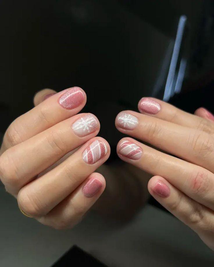 Soft pink shimmer nails paired with white snowflake and line designs for a clean, feminine January look. The mix of simple accents keeps the style fresh and understated.