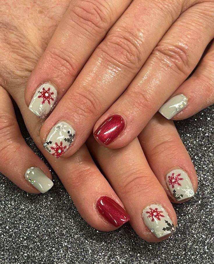 A blend of muted gray nails with red and black snowflakes, balanced by a bold, glossy red accent nail. The contrast adds a festive yet winter-appropriate January touch.