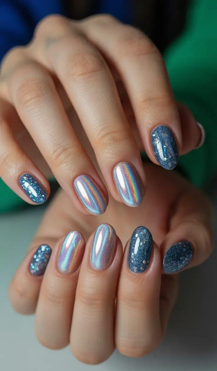 This design mixes icy holographic chrome nails with deep blue glitter accents, creating a frosty, celestial vibe. It feels modern, shimmery, and perfect for a cool- January toned winter look.
