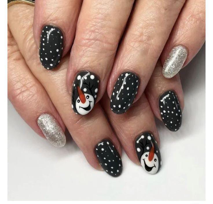 Charcoal-black nails with scattered white dots mimic falling snow, while the cute snowman accent nails add a playful January winter touch. A pop of silver glitter keeps the look festive.