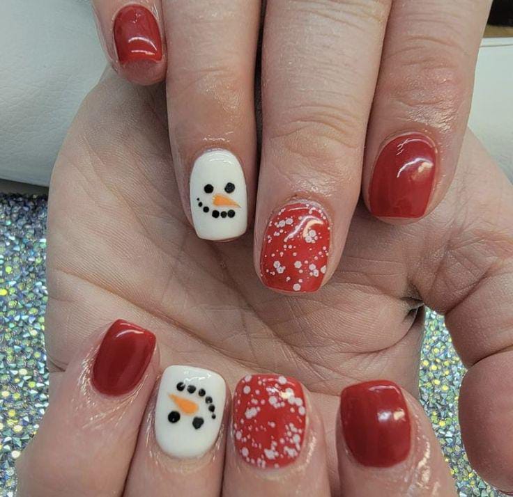 Bold red nails pair with white snowman accents and soft snowy speckles for a cozy, cheerful January feel. It’s simple, bright, and full of seasonal personality.