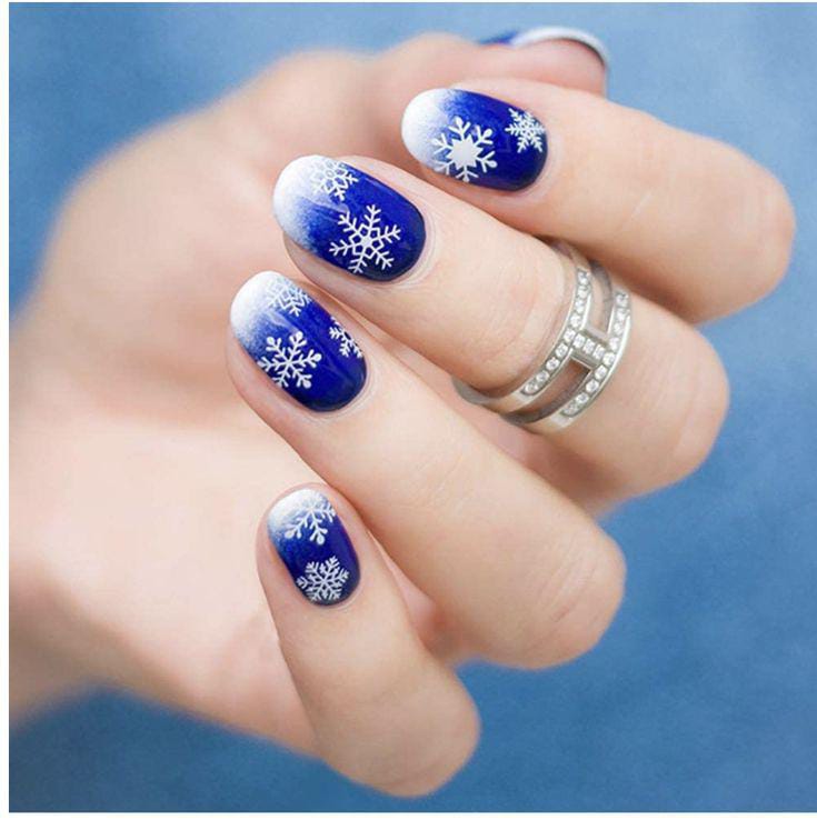 Deep blue nails fade into a soft white tip topped with delicate snowflake motifs, giving the design a crisp, icy gradient. It’s elegant, wintry, and beautifully minimal January touch.