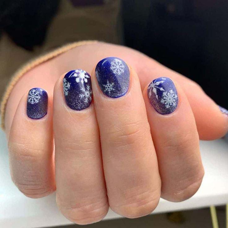 Deep, shimmery navy nails are topped with delicate white snowflakes, giving the design a crisp, frosty feel reminiscent of a quiet January night.