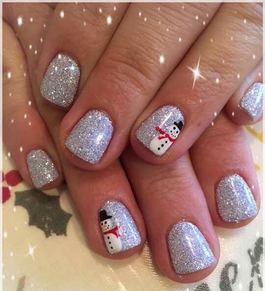 These short nails shimmer with full silver glitter, while a couple of nails feature cute snowmen for a fun, frosty twist. The look is bright, festive, and perfect for a sparkling January winter mood.