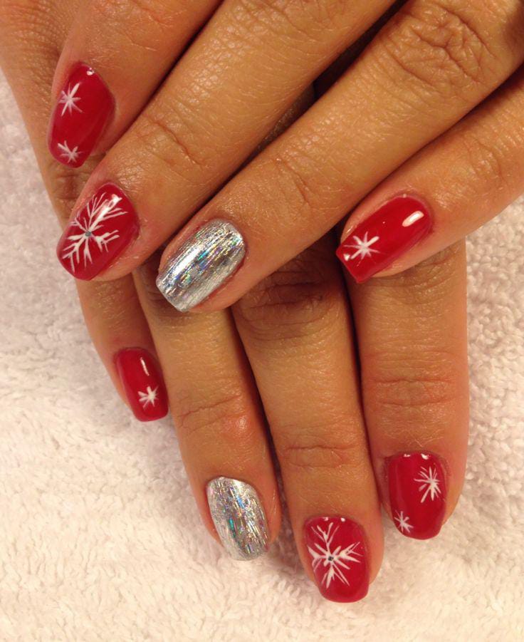 This look pairs bold red nails with simple white snowflake accents and a single silver foil nail, giving the whole design a festive and cheerful January winter vibe.