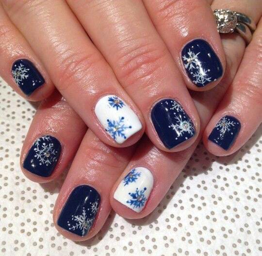 Deep navy nails and crisp white accents come together with delicate blue and white snowflakes, creating a cozy, wintry look that feels perfect for cold January nights.