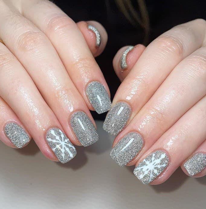This look features soft, natural-toned nails coated in fine silver glitter, giving them a frosty shine perfect for winter. A couple of nails have delicate white snowflakes that add a festive January touch without feeling too bold.