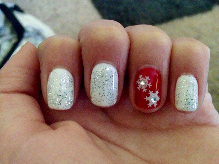 Soft white glitter nails get a playful contrast with a single red snowflake-accent nail, adding a cute pop of color while still keeping the January look wintry and fresh.