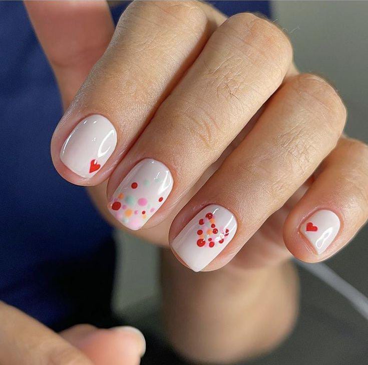 Milky white gel short nails feature tiny hearts and soft confetti-style dots. The design is clean, minimal, and effortlessly cute for Valentine’s Day.