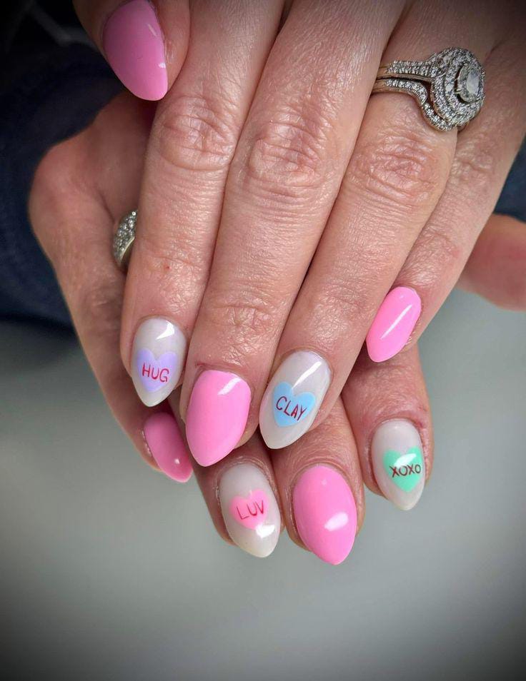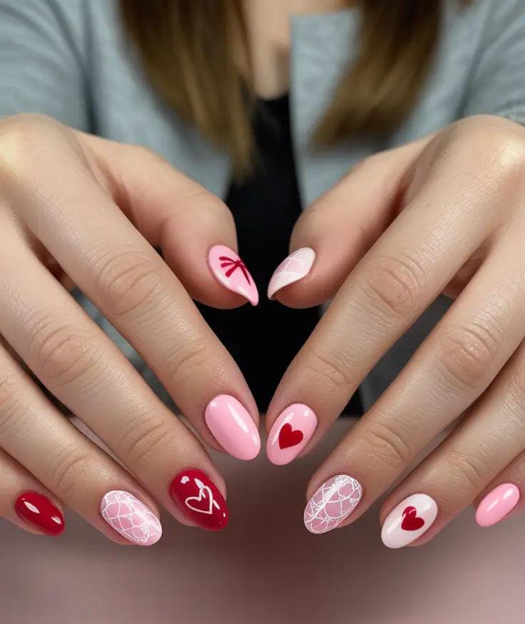 Soft pink and red gel shades are combined with heart and envelope-inspired nail art. The design feels sweet, romantic, and slightly whimsical Valentines.