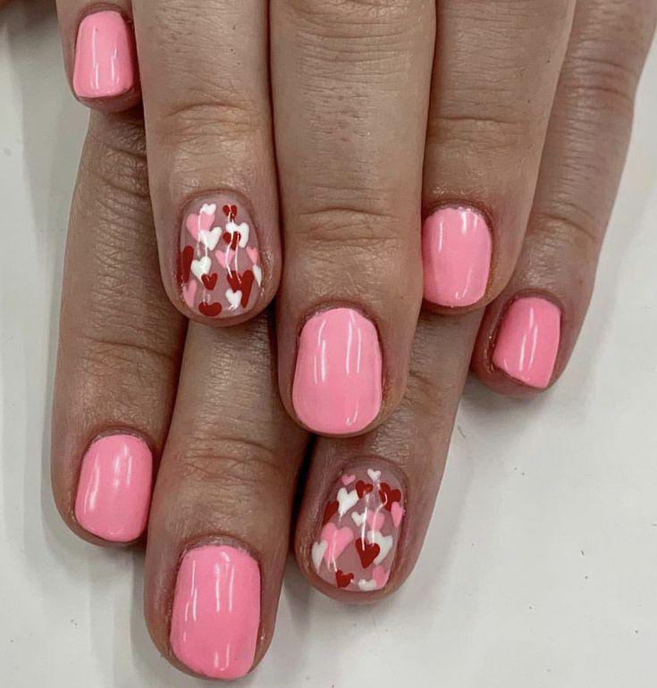 Classic short pink gel short nails are paired with nude accent nails covered in scattered heart patterns. The design feels cheerful, youthful, and perfect for a subtle Valentine touch.