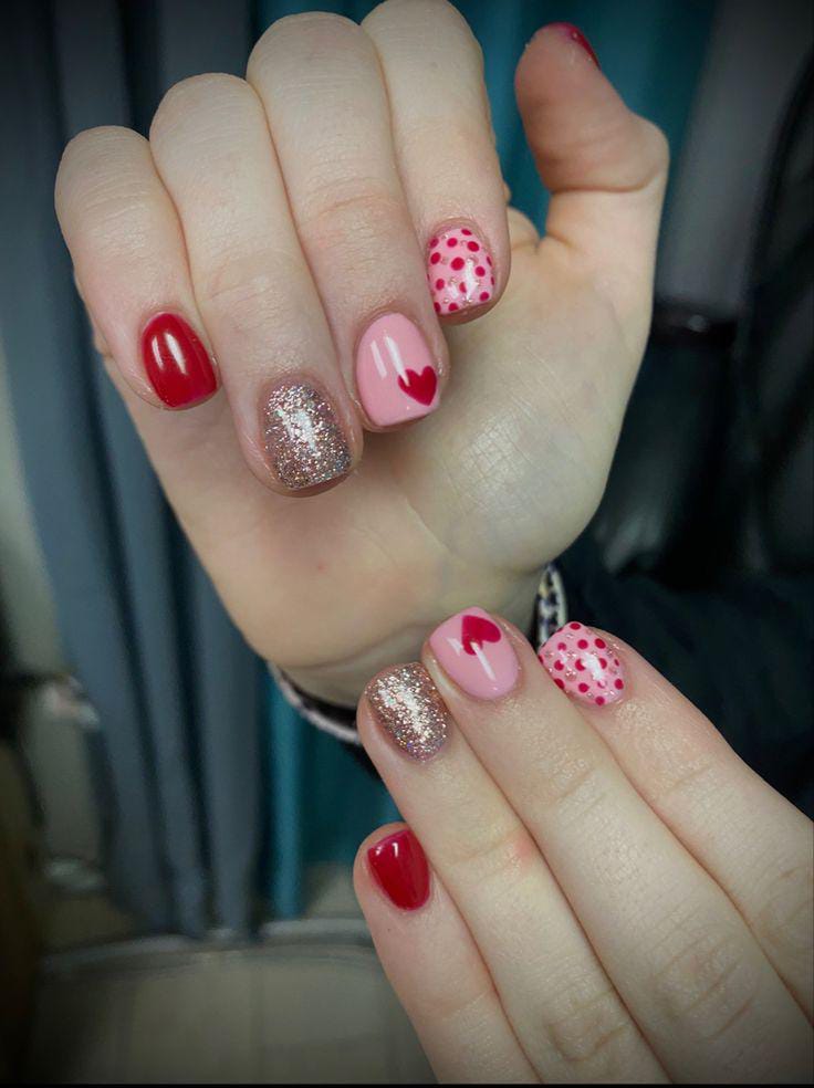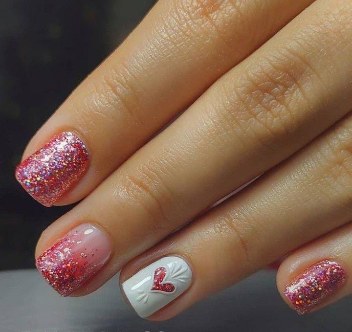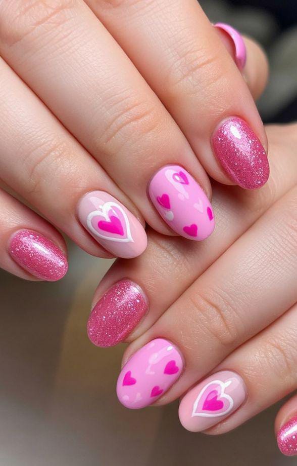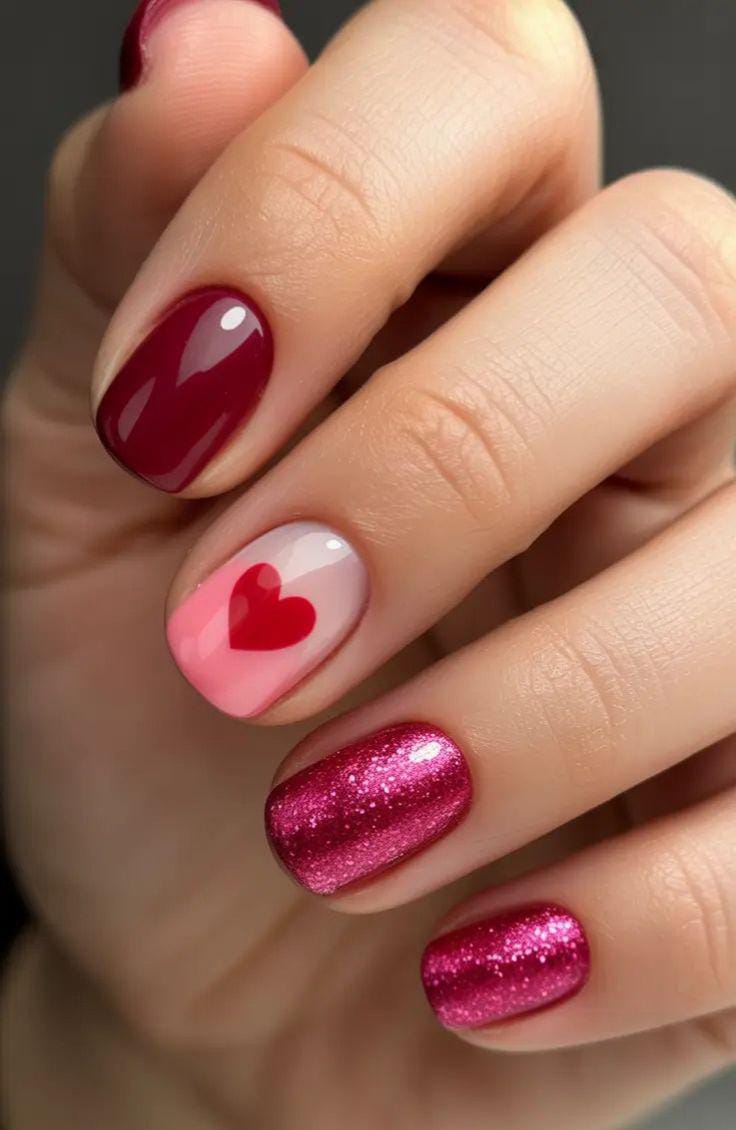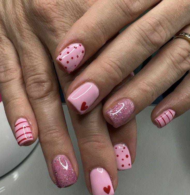 These pink, red, and glitter short nails with simple heart details for a stylish contrast. It gives a festive Valentine feel with a hint of sparkle and elegance.