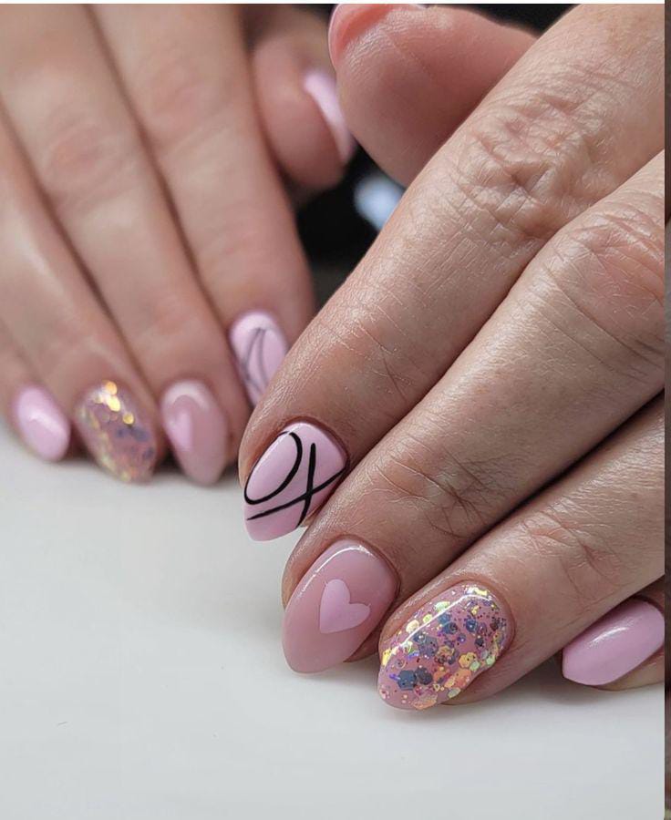 Light pink gel short nails are combined with glittery accents and subtle heart confetti designs. The overall look is sweet, delicate, and very feminine Valentines.