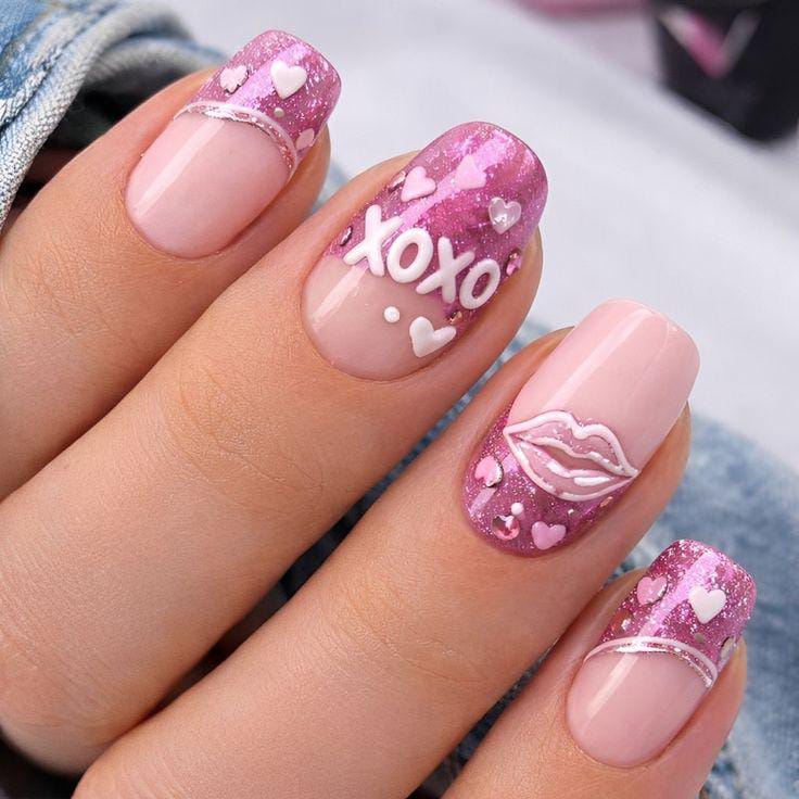 This design mixes soft pink gel nails with glittery tips and cuticles and small heart designs for a playful Valentine look. The “XOXO” and lips detail adds a fun, romantic vibe without feeling too bold.
