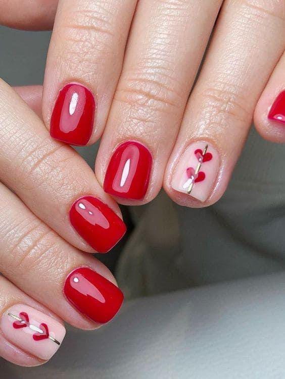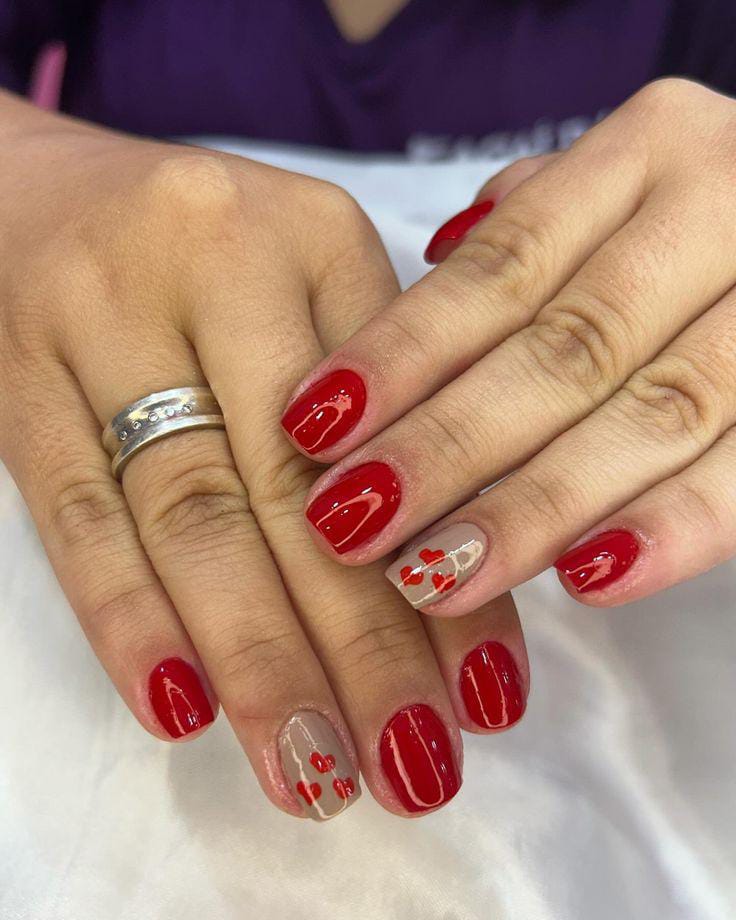Glossy red gel short nails are paired with a neutral accent nail featuring delicate heart details. The look is bold, clean, and timeless with a romantic Valentine twist.