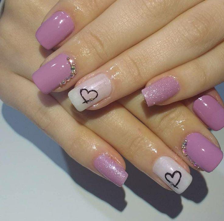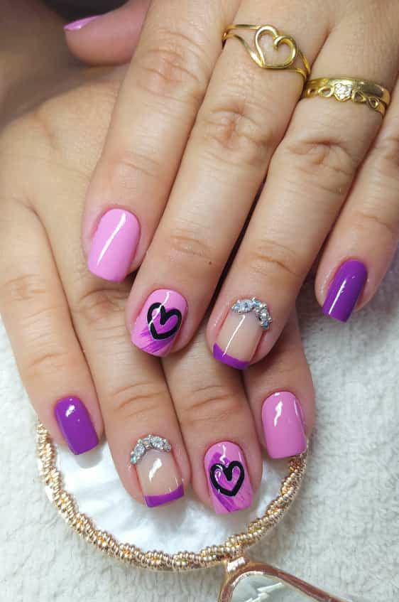 This design mixes soft pinks and purples tips, short nails with glossy gel finishes and cute heart ,rhinestone accents. The vibe is playful, romantic, and perfect for a fun Valentine look.