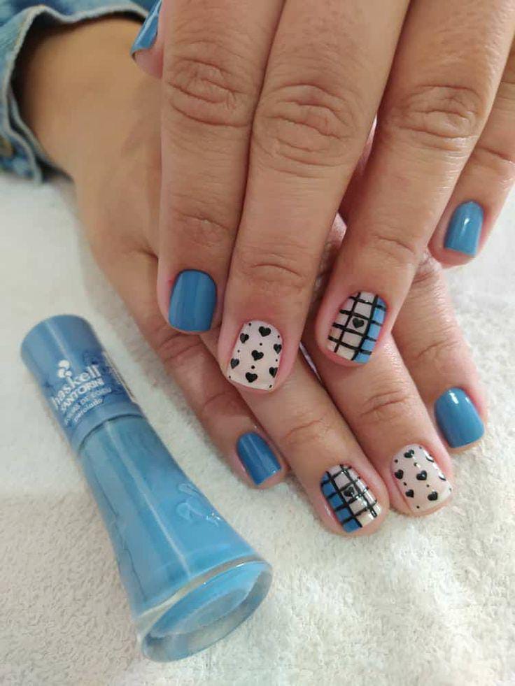 Muted blue gel short nails are paired with white accent nails featuring tiny black hearts and grid patterns. It feels modern, cozy, and slightly artsy while still keeping a Valentine touch.