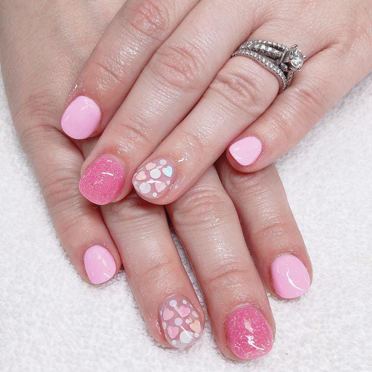 Shimmery pink gel short nails are combined with layered heart designs on nude base for a bright Valentine look. The mix of sparkle and soft tones creates a fun yet polished finish.