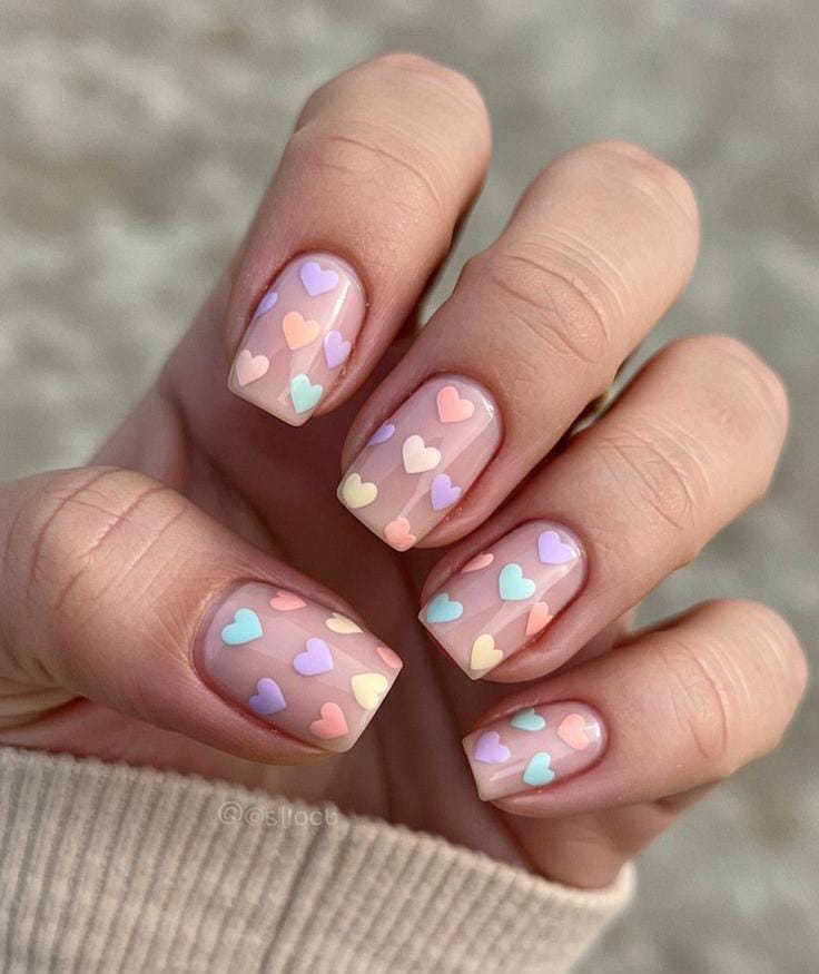 Soft nude gel short nails are decorated with tiny pastel heart shapes in a scattered pattern. The look feels playful, sweet, and perfect for a light Valentine vibe.