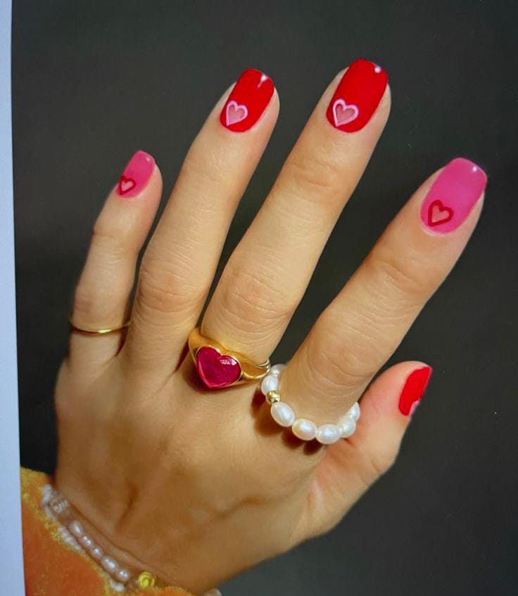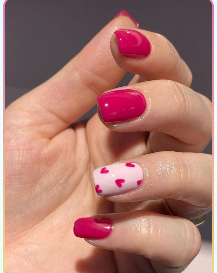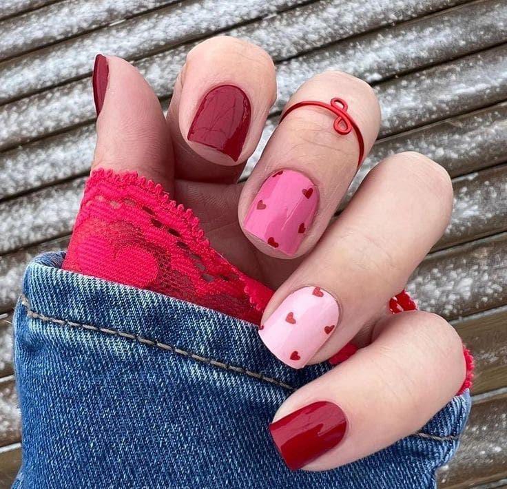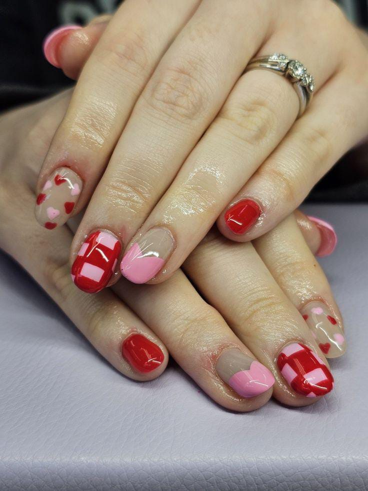 This design mixes deep red and soft pink gel shades with tiny heart accents for a playful Valentine vibe. The overall look is cute, cozy, and perfect for short nails.