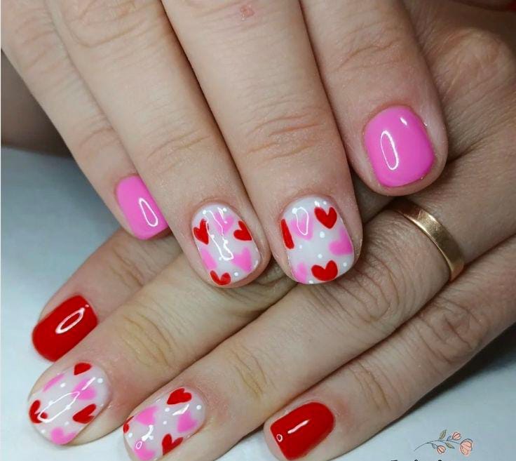 Glossy pink and red gel short nails are mixed with clear bases filled with small heart and dot details. The style feels cheerful, fun, and slightly playful Valentines .