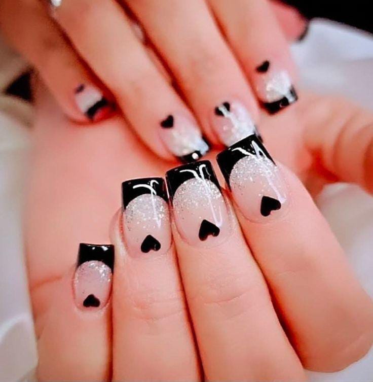 Short gel nails combine black French tips with soft glitter fades and tiny black hearts. The overall vibe is elegant, modern, and a little edgy Valentines.