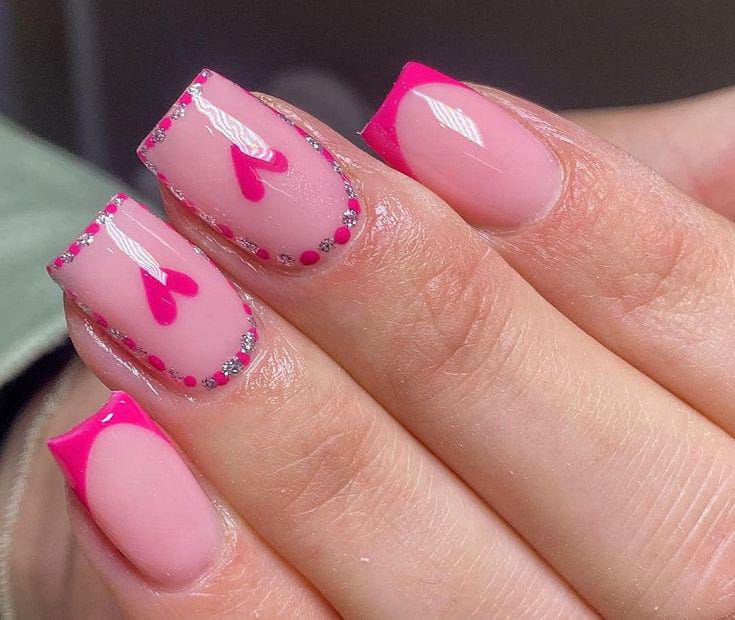 Blush pink gel short nails are framed with hot pink and glitter edges, french tips and delicate heart accents. The design feels trendy, flirty, and eye-catching Valentine without being too busy.