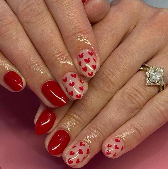 This design mixes glossy red gel short nails with a soft nude base covered in tiny red hearts. It feels playful, romantic, and perfect for a cute Valentine look.